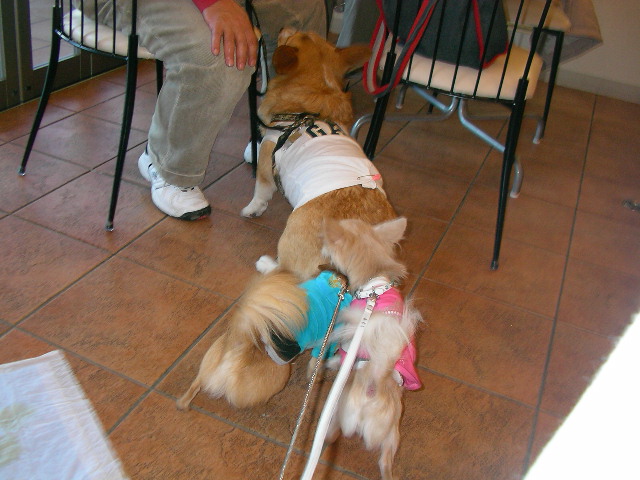 カフェに来てたコーギーちゃんに挨拶しに行くラスク&ミルク。